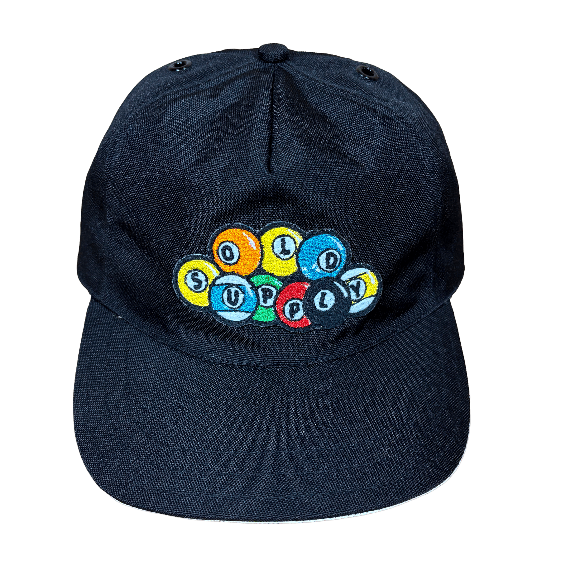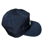 Traditional snapback made from waterproof black fabric featuring our "Play Pool" Embroidery Patch, each hat is made to order.